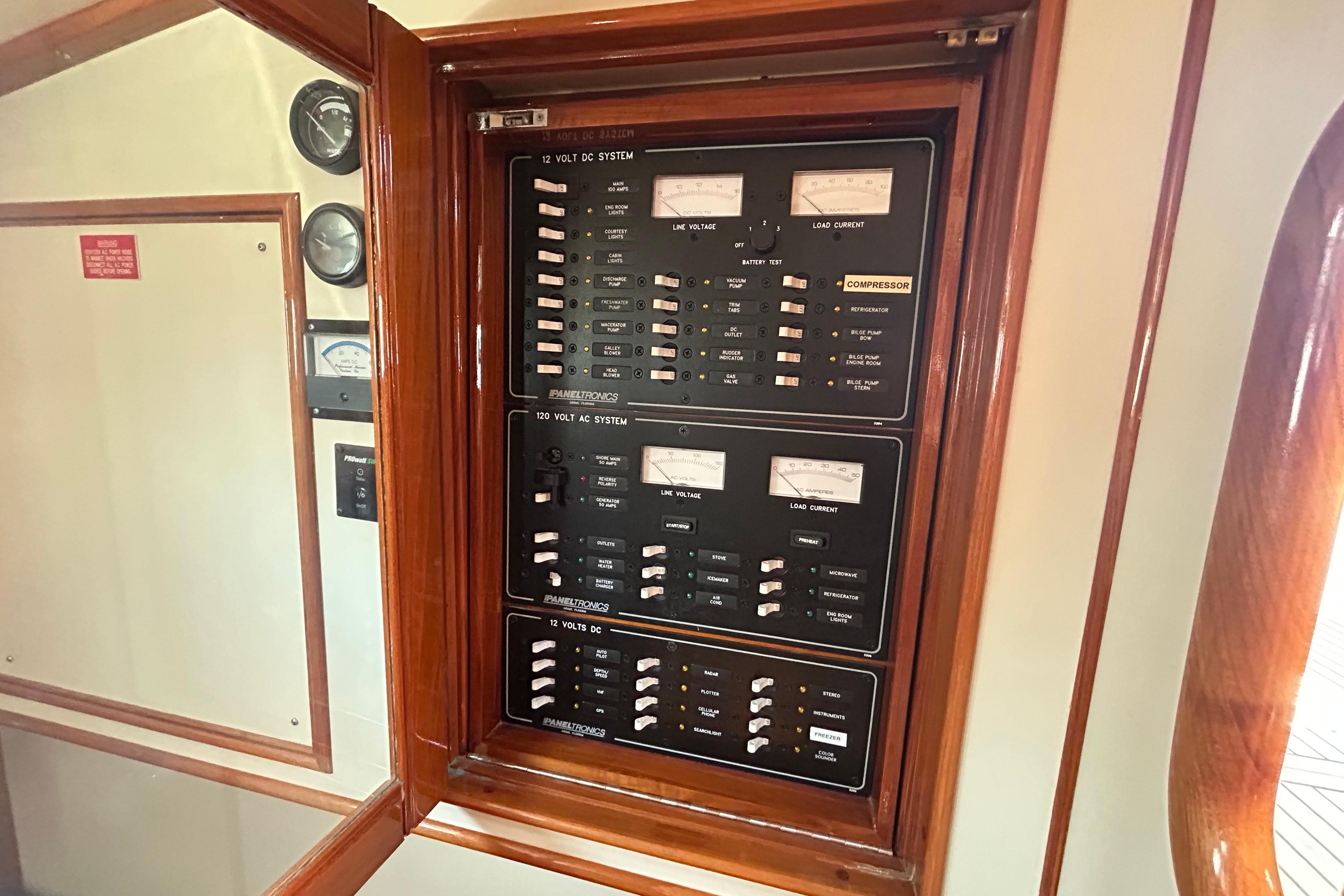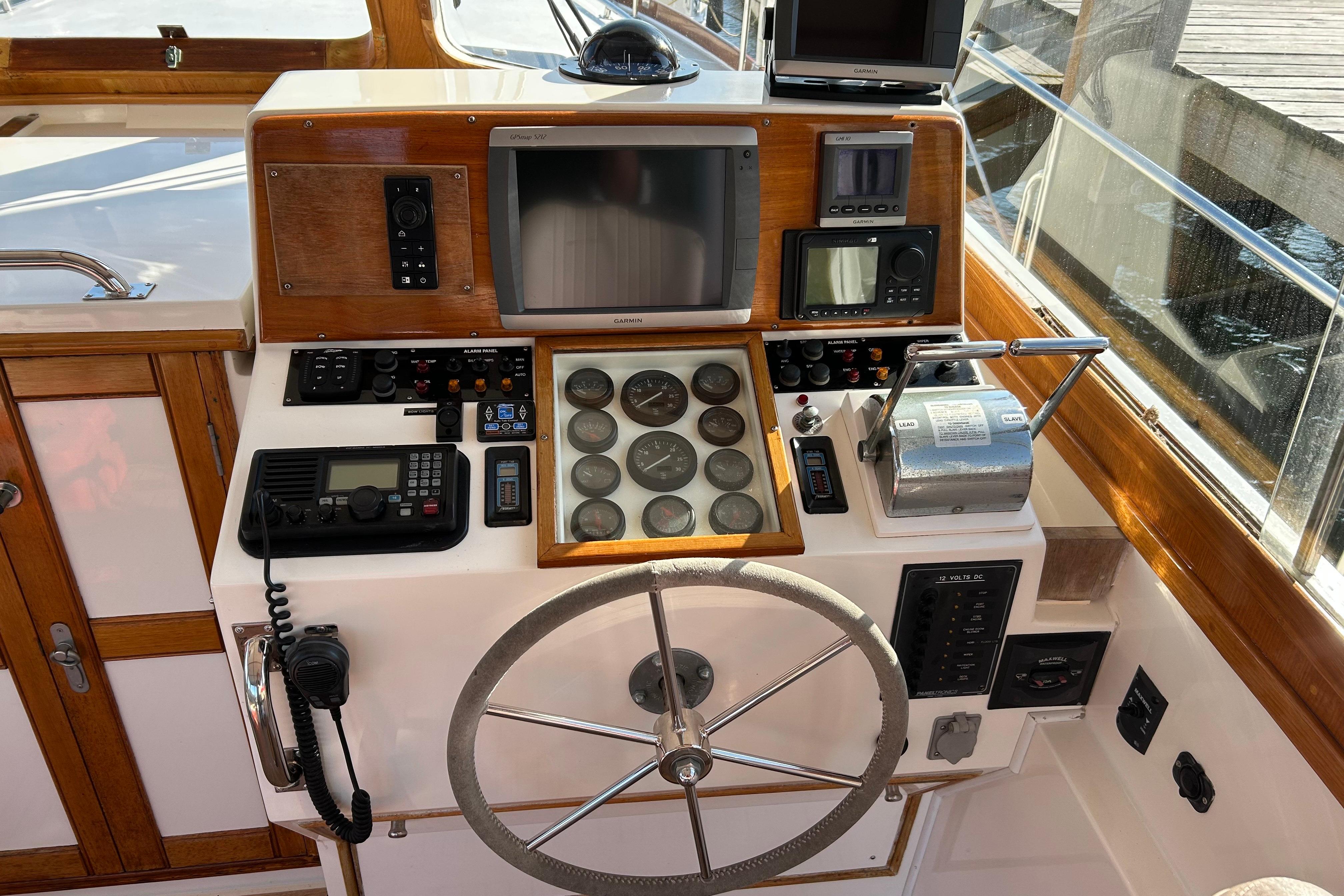 At the helm, you'll find a thoughtfully arranged electronics suite, featuring user-friendly controls in a classic layout designed for all mariners. The station includes autopilot, throttle synchronizer, and an intuitive Bennett Auto Tab Control system for ease of navigation and handling.