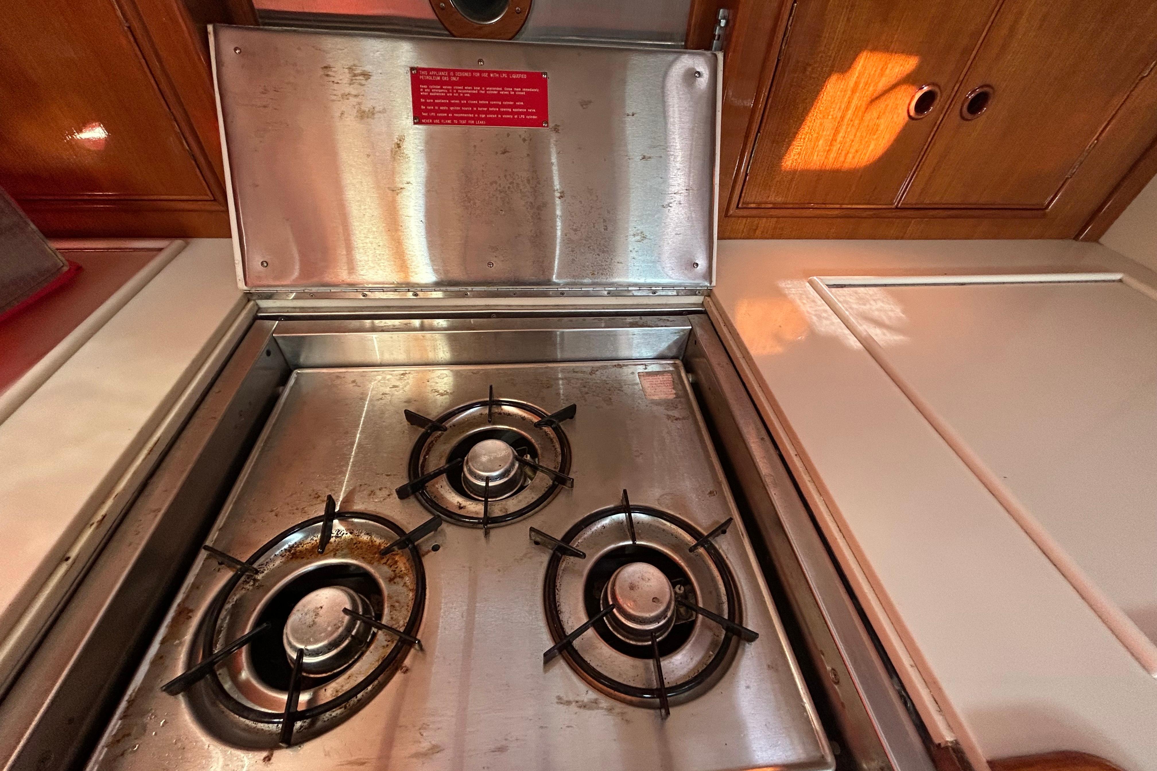 Inside, the boat features beautifully preserved teak throughout, lending a warm and inviting atmosphere. The full U-shaped galley is equipped with elegant Corian countertops, a double sink, convenient countertop access to the refrigerator, and a separate dry storage area with an adjacent freezer. Cooking amenities include a 3-burner gas cooktop, a convection microwave, and generous overhead storage.