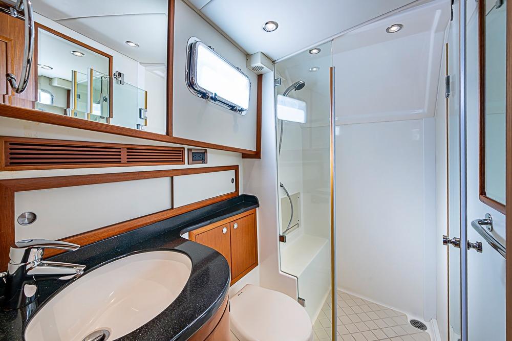 Accommodations are down three (3) steps with the Master Stateroom forward and Guest Stateroom to port. The private Master Stateroom features an Island queen berth with four (4) storage drawers beneath, hanging lockers port and starboard, and additional storage in lockers, drawers and night table. The en suite master head has a separate stall shower. The Guest Stateroom features twin side-by-side single berths, hanging locker and direct access to the guest head from the stateroom. The Guest Head is also accessed from the companionway as a day head.
