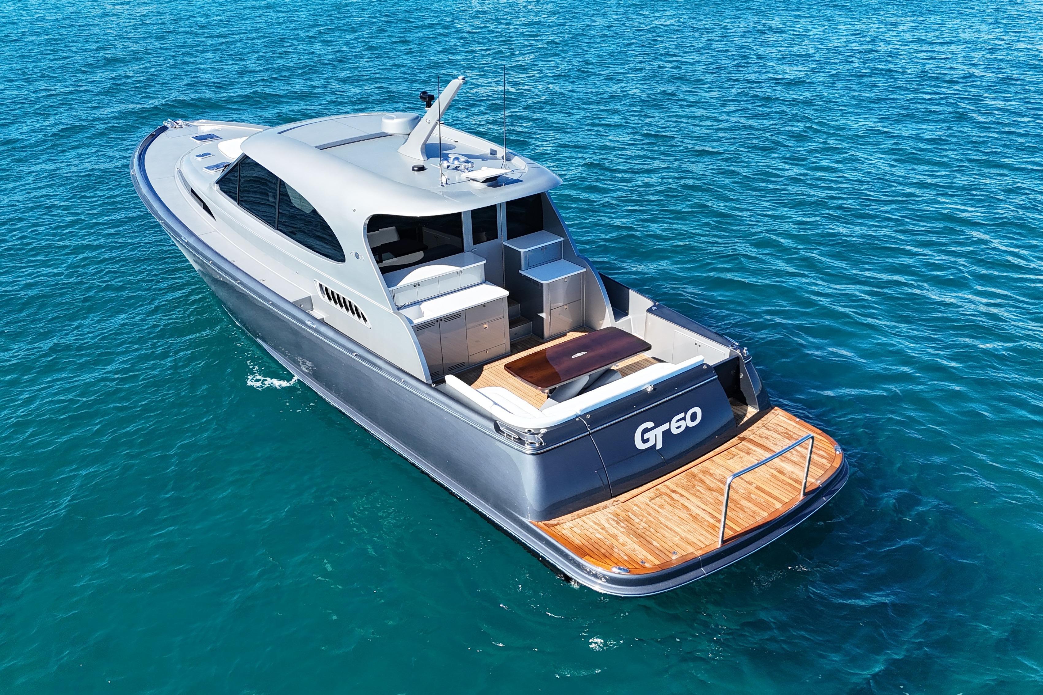 The sleek curves captivate you at first glance, and her unparalleled performance alongside the boat’s impeccable fit and finish is guaranteed to leave a lasting impression. The layout of the yacht is designed around maximizing entertaining spaces flowing directly from the large teak swim platform, through the transom access to the full beam cockpit and salon. Featuring a centrally located wet bar, with plenty of comfortable seating and large electric windows side and aft, you and your guests will love cruising on the GT60.